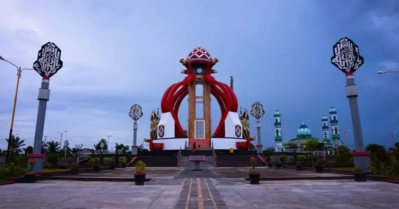 - Pemandangan Masjid Agung Wahyu Al Hadi, terlihat jelas dari seberang tugu, memperkuat pesan harmoni antara nilai adat dan spiritualitas Islam di Sampit.